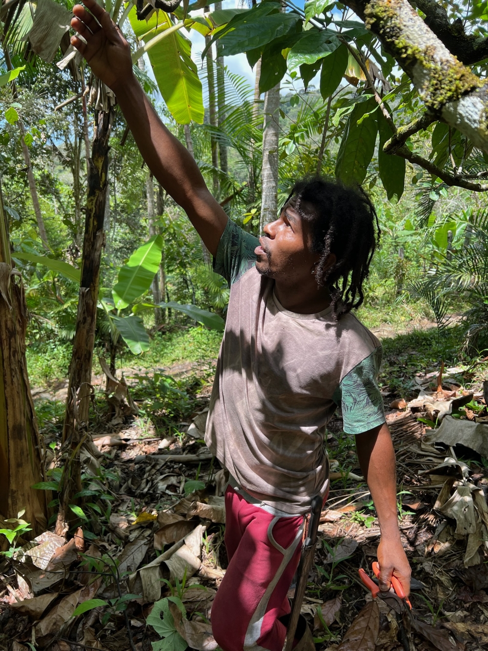 Lungo il nostro cammino dalla montagna verso il mare, ci fermeremo al Kilombo Tenondé, per immergerci in un laboratorio vivente di autonomia e cultura afrodiscendente, guidati dal Mestre Cobra Mansa, guardiano e diffusore della capoeira d’Angola. Pianteremo, cucineremo, danzeremo: non per assistere, ma per partecipare. Infine, giungeremo a Serra Grande, nella Costa do Cacau, dove le comunità rurali e indigene Tupinambá stanno riscrivendo il futuro attraverso la coltivazione consapevole del cacao, l’educazione orale, la protezione della foresta e dei suoi encantados (guardiani della natura).