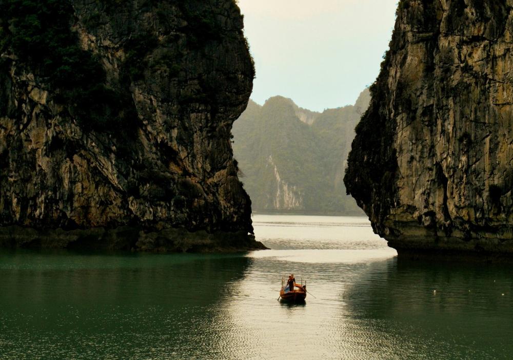 Una volta saliti a bordo della giunca tradizionale, viene assegnata la cabina (dotata di aria condizionata, bagno privato e acqua calda). Dopo il benvenuto dell’equipaggio, si parte lentamente alla scoperta della baia Ha Long, in una delle aree meno turistiche (ma comunque turistica), ovvero Bai Tu Long: più silenziosa e meno affollata rispetto ad alcune zone di Ha Long.