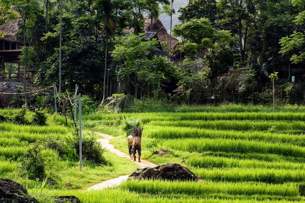 Il trekking attraversa villaggi rurali, piccoli corsi d’acqua e terrazze a perdita d’occhio, che cambiano colore a seconda del mese: a inizio agosto il riso è verde intenso, punteggiato da lavoratori che curano le giovani piante. Bambini seduti sui muretti salutano al passaggio, le donne portano cesti di bambù sulle spalle, mentre il fumo delle cucine esce dalle case in legno.